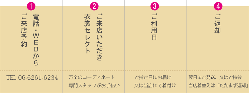 | 着付け・ヘアセット承ります | 着付け・ヘアセットも承ります。 当店でお着付け → そのまま結婚式場へ。大阪市内の式場へもアクセス抜群。出張着付けもご相談ください。 |