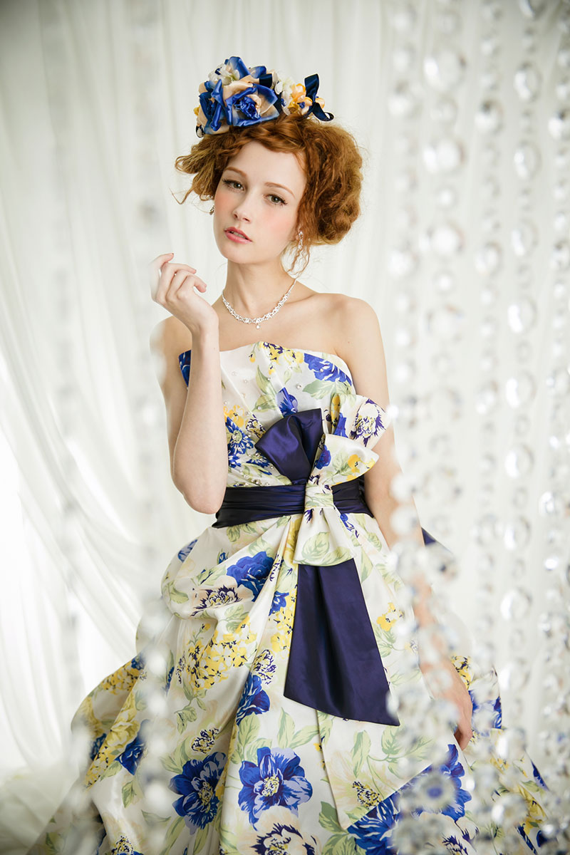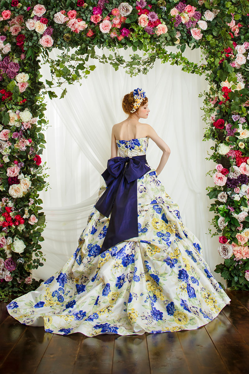 大人っぽいネイビーに花柄をプラスすることで大人可愛いドレス。胸元とバックスタイルのリボンでより可愛く個性的に!