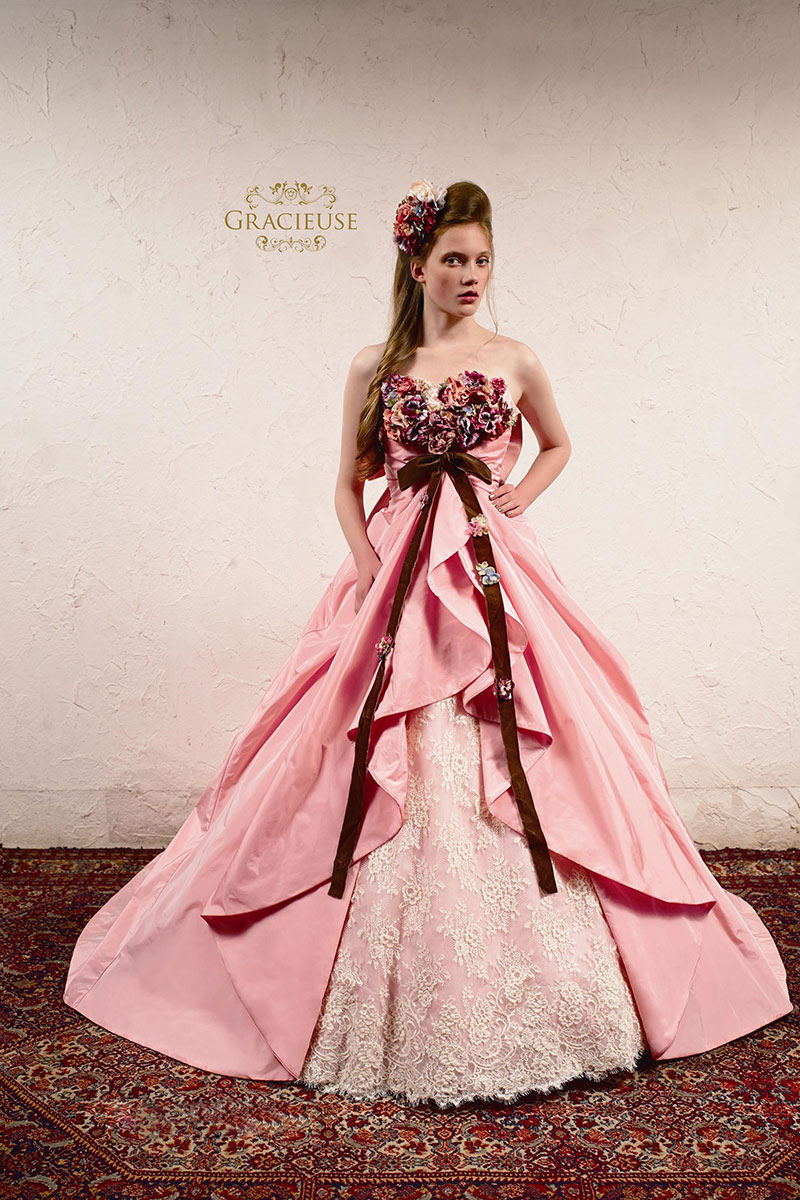 胸もとの花とリボンがかわいいピンクベースの上品なドレス。