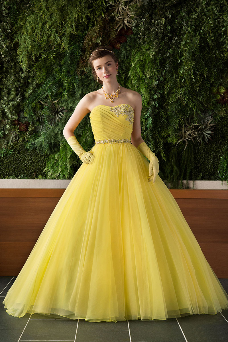 ウエストラインをスッキリと見せ、スカートはボリュームあるチュールで美しいスタイルに魅せます。人気のビタミンカラーに胸元の飾りが可愛らしいカラードレスです。