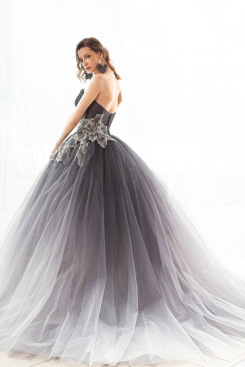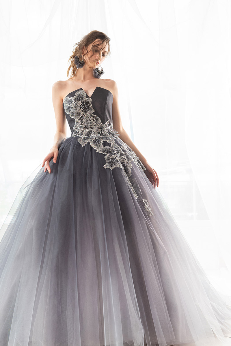 胸元のVカット、流れるような美しいグリッターのお花が特徴のドレス。 ディープカラーの裾にかけて明るくなるグラデーションのチュールが大人っぽいです。
