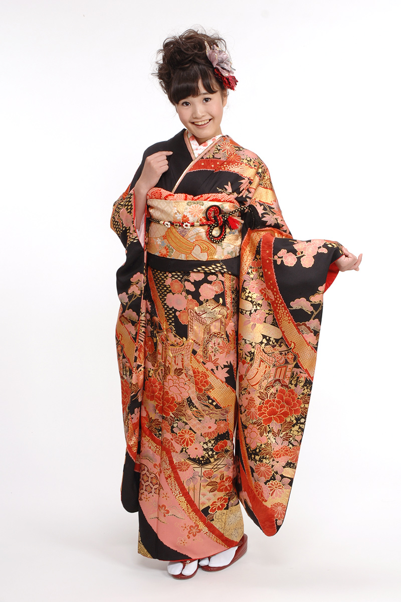 黒地に源氏車・菊・牡丹・熨斗・梅・松などの文様を金とピンク、赤色で描いた華やかな振袖。
