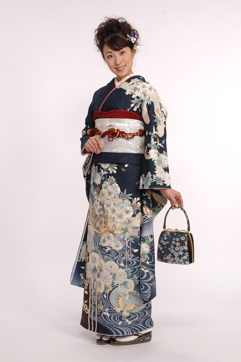 グレー紺にラメが光る地色に観世水と菊や桜、蝶を幻想的に描き、ドレスの様な雰囲気の振袖。
