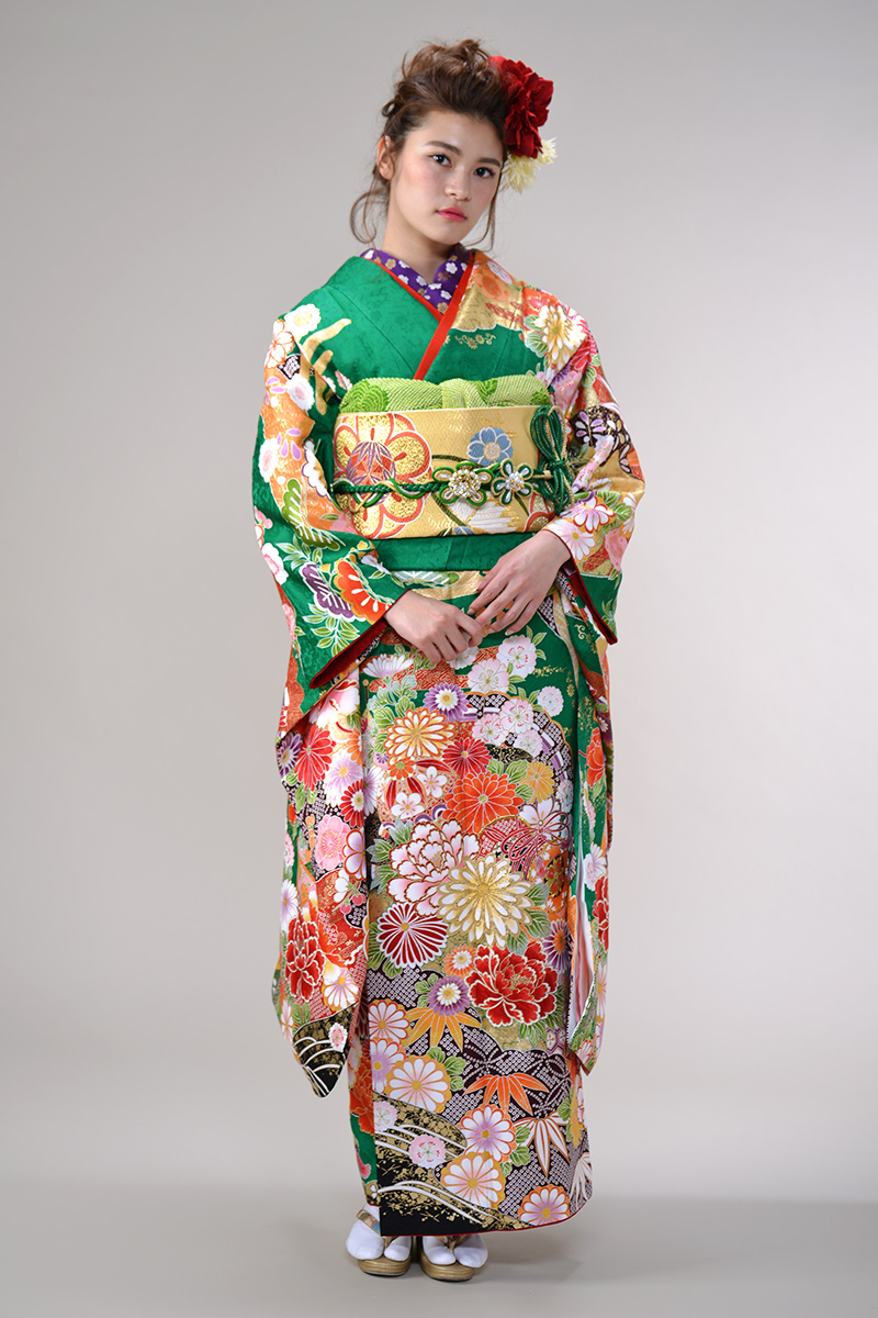 鮮やかなグリーンに、緑取りの菊・なでしこ・松・シャクヤクを大きくあしらい百花繚乱の鮮やかな振袖。