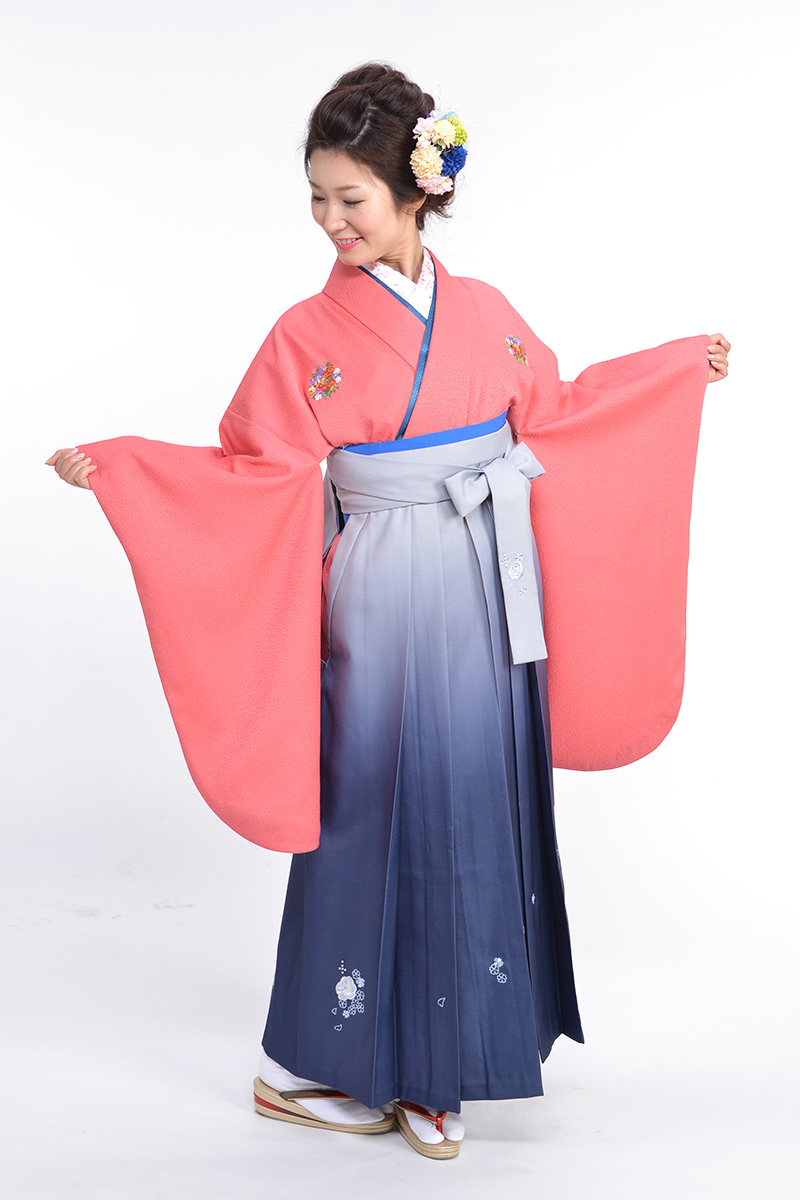 薄藤色~紅桔梗へのグラデーションに花の刺繍をあしらったおしとやかな袴。 真朱(まそお)地一色に花刺繍紋の小振袖。
