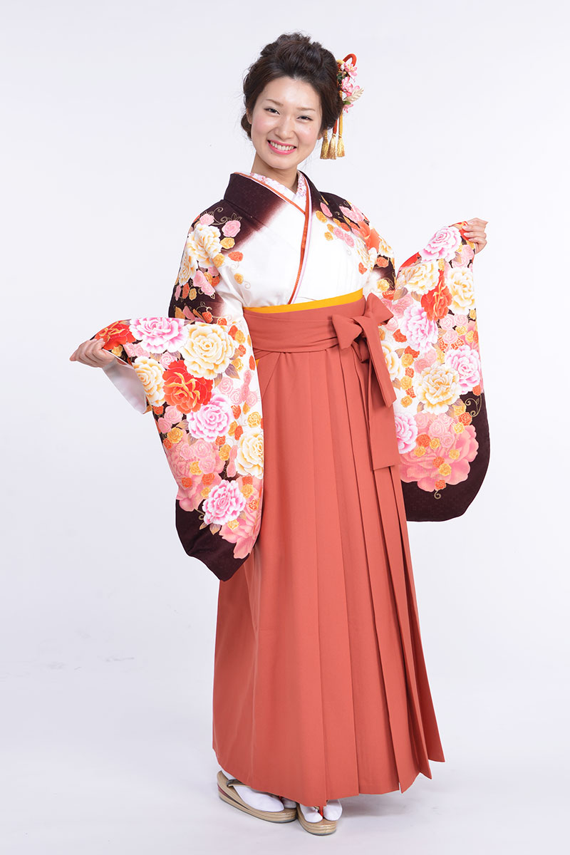 紅非色一色の袴。紫~白のぼかしに朱・黄・オレンジ色の大小の花をふんだんに配した小振袖。