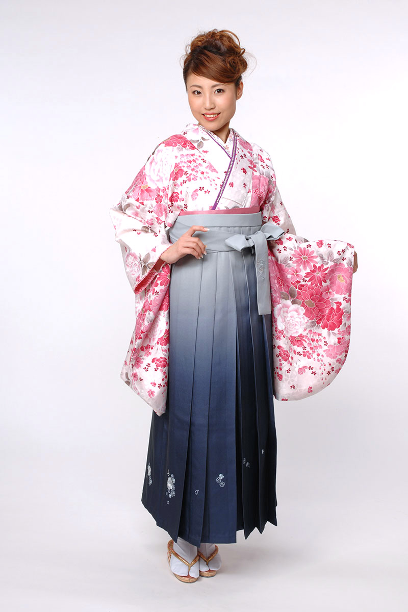 灰靑から濃藍へのグラデーションにきれいな花の刺繍の袴。 薄桃色地に、濃淡・大小の花でグラデーションを醸しだした小袖。