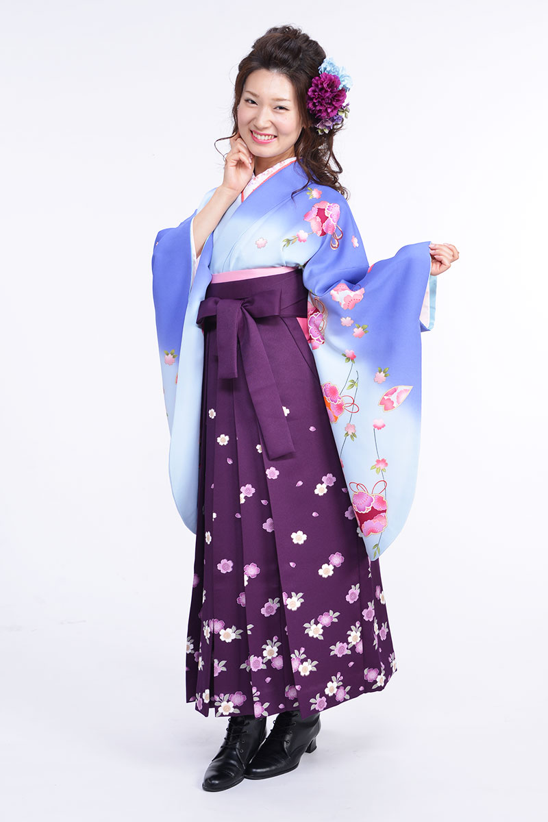 茄子紺一色に白やピンクの花の刺繍を花吹雪の様に降らした袴。 ブルーから空色のグラデーションに、ピンクの蝶や花を縦に配した小振袖。
