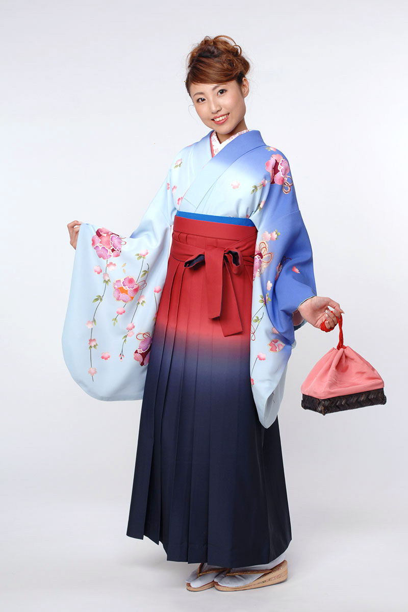 紅~薄縹(うすはなだ)~留紺へぼかしの袴。 上前にブルーから水色のぼかし、緑の蔓にピンクの花を咲かせた小振袖。