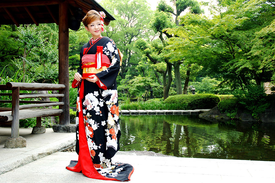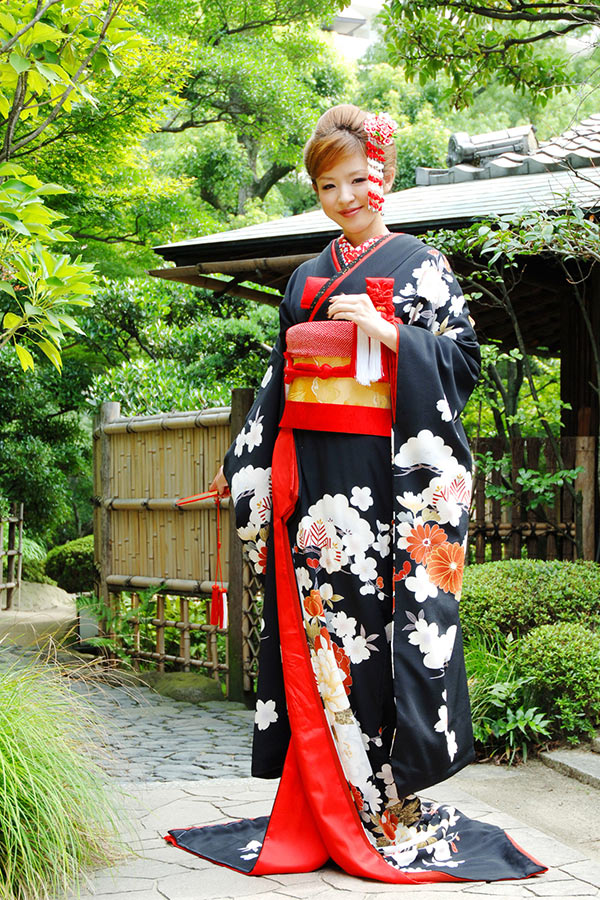 【レンタル・引き振袖】黒地に白、赤の花柄が特徴的な引き振袖