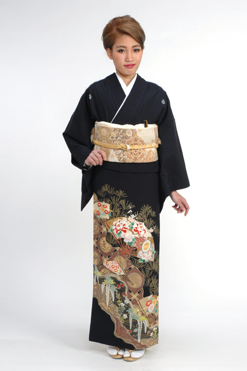 扇と松葉の大胆さを牡丹と藤の花で優しく包んだ留袖