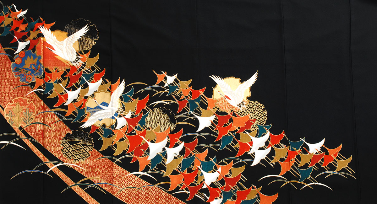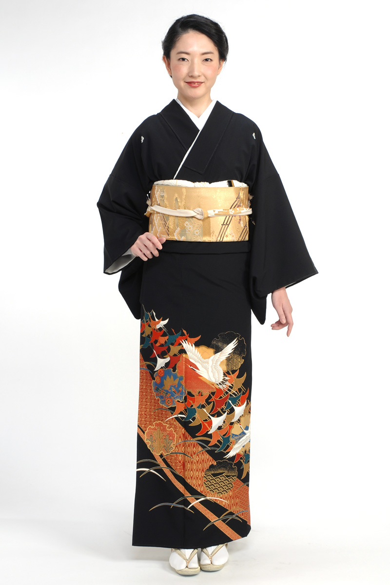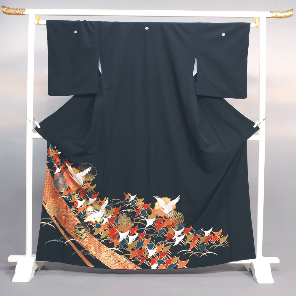鶴の群れの中を一羽の鶴が優雅に舞う高貴な趣の黒留袖