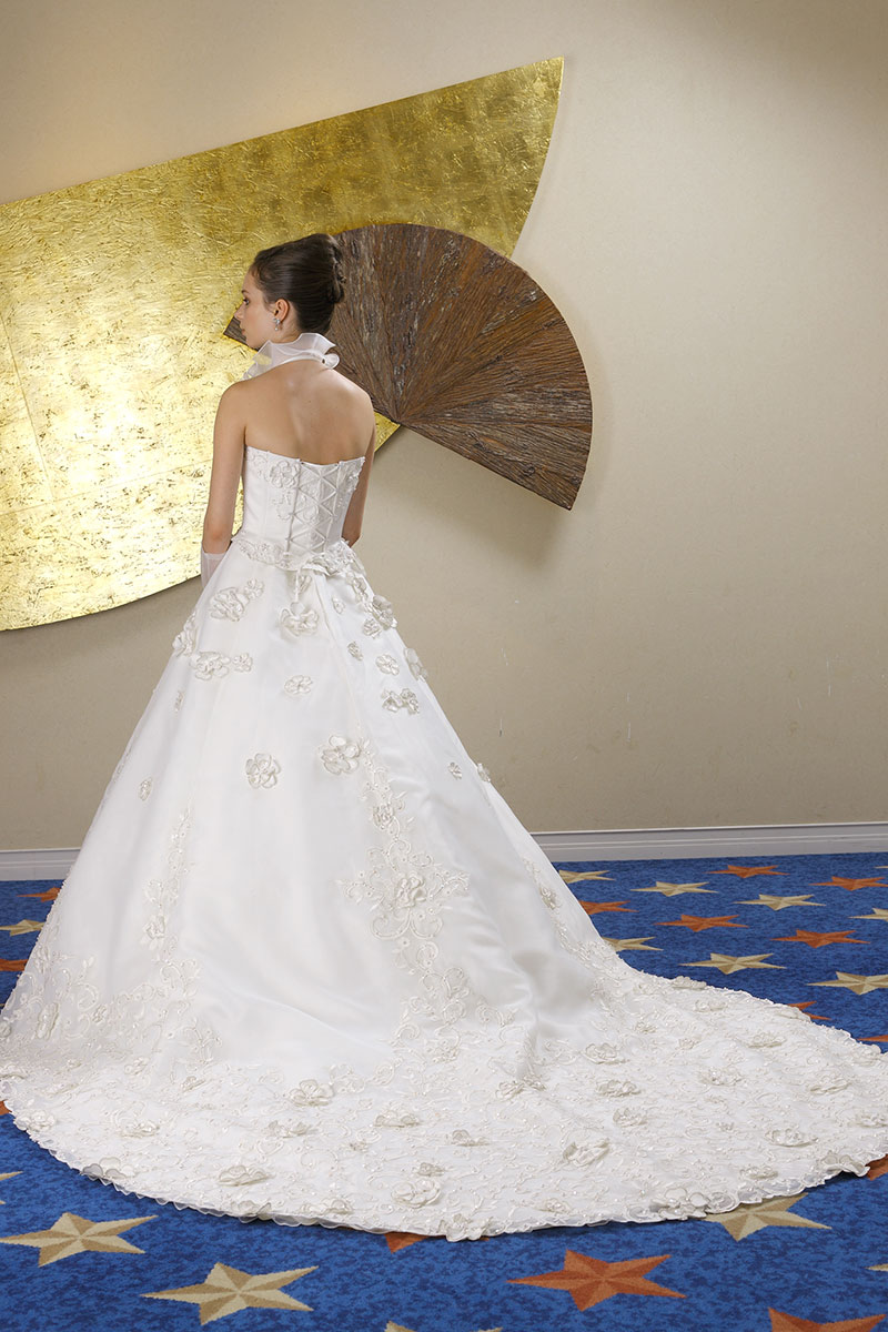 ボリュームあるお花のプリンセスライン。 お花を取り外し、飾り過ぎないミニマムなコーディネートも可能なウエディングドレス。