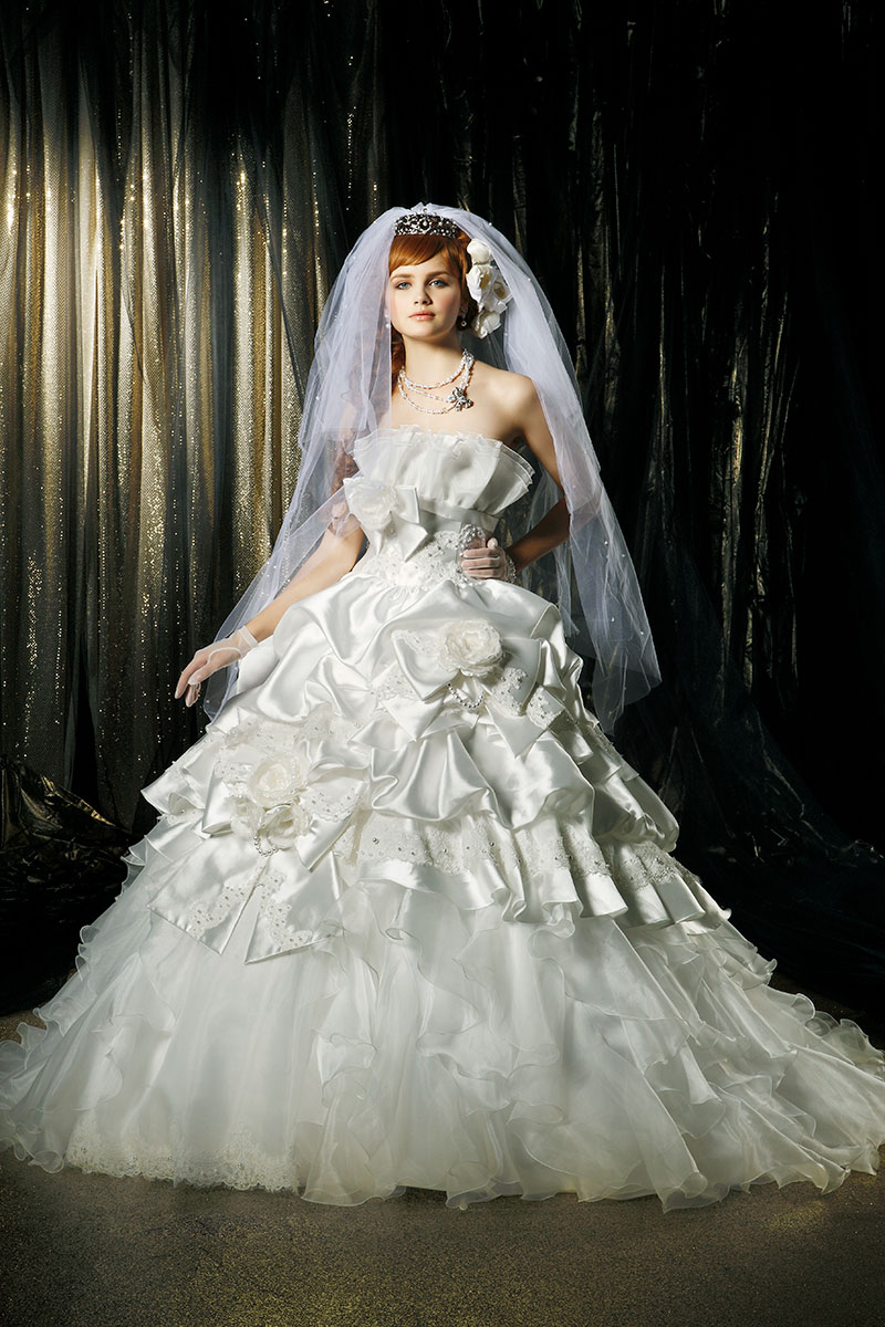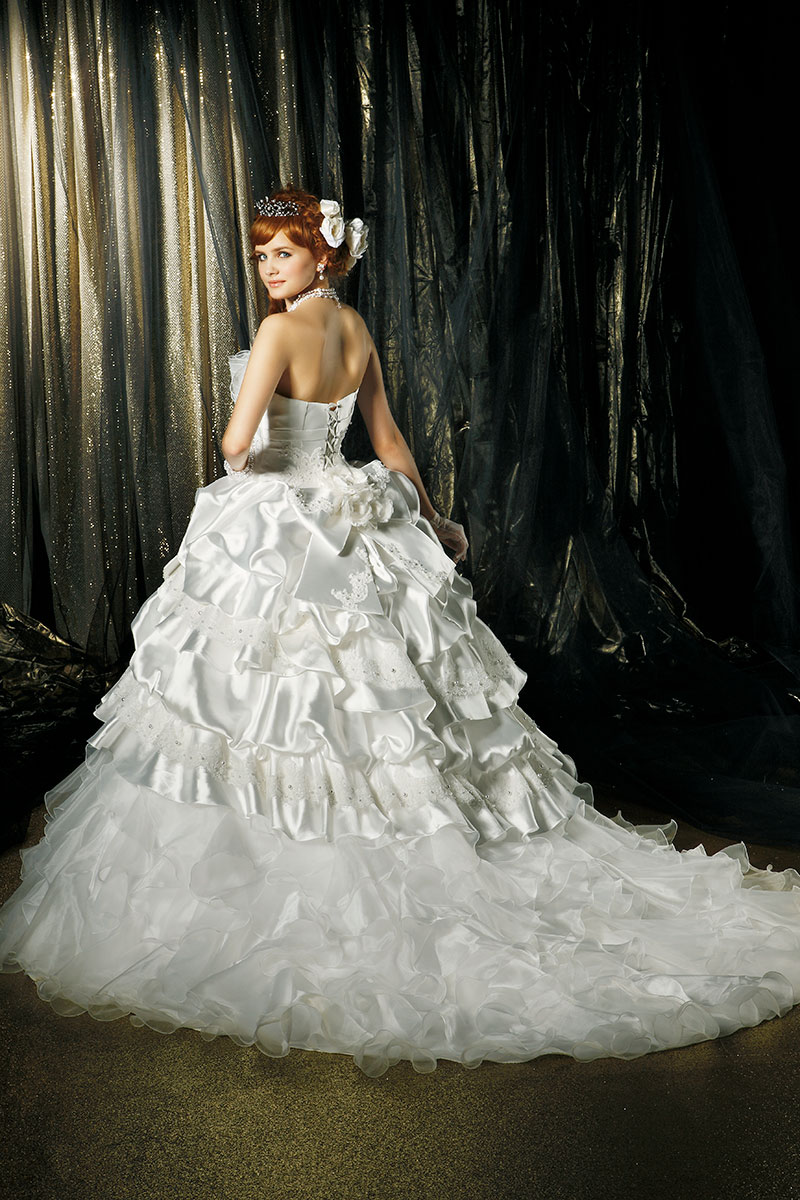 ボリュームのあるサテンのフリルでプリンセス気分なウエディングドレス。輝くパールホワイトで魅せるデコルテ。