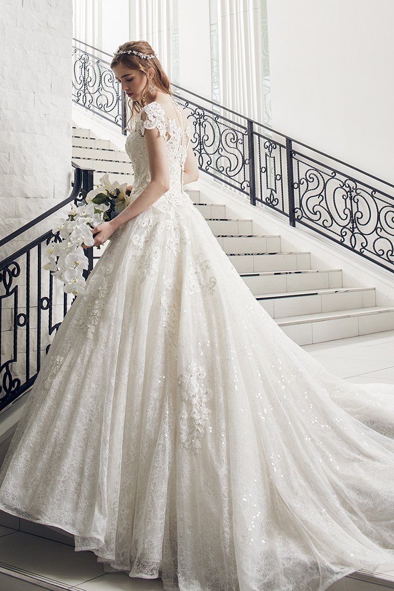 ビスチェからスカートに広がる上品で華やかな総刺繍のドレス。