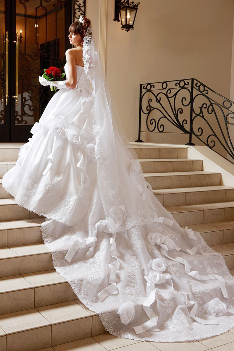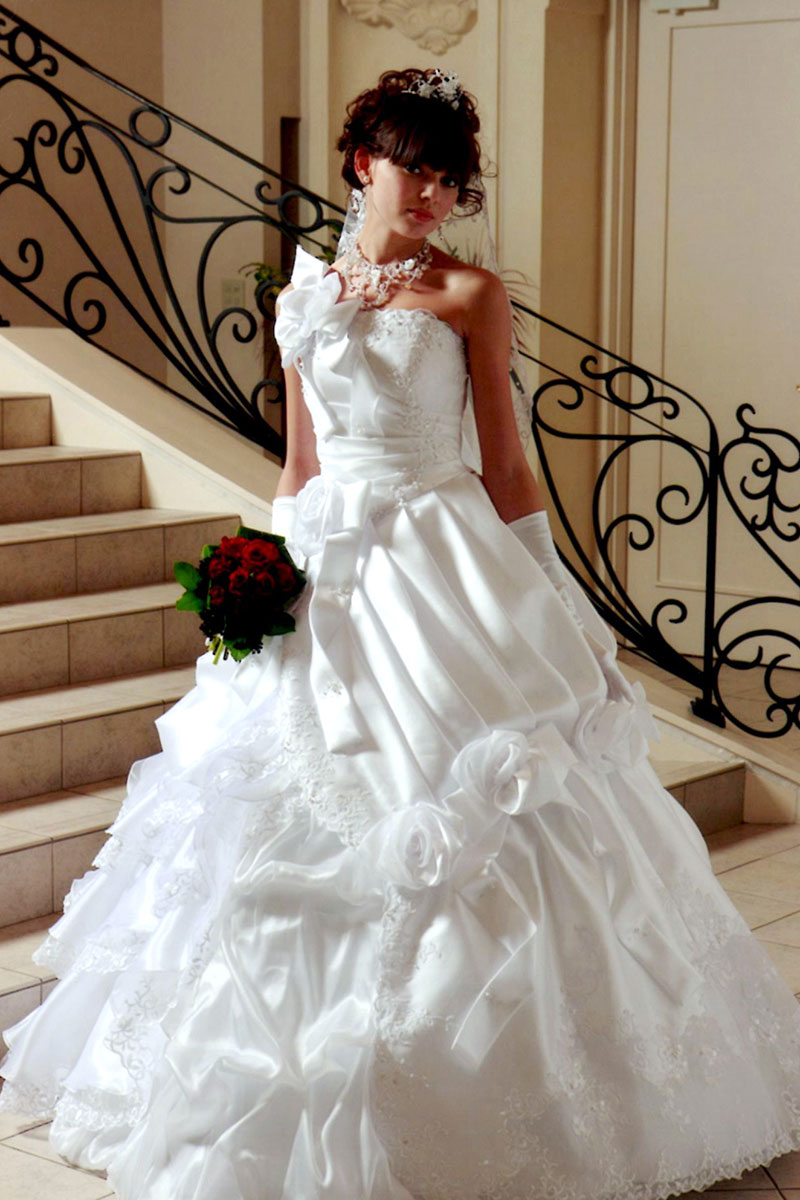 バラをモチーフにした飾りと左右のラインが違うのもとってもおしゃれなウエディングドレス。