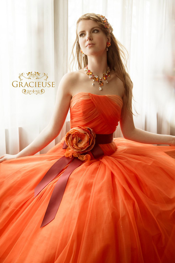 これからの季節、オレンジ色や赤色などのカラードレスと合わせると